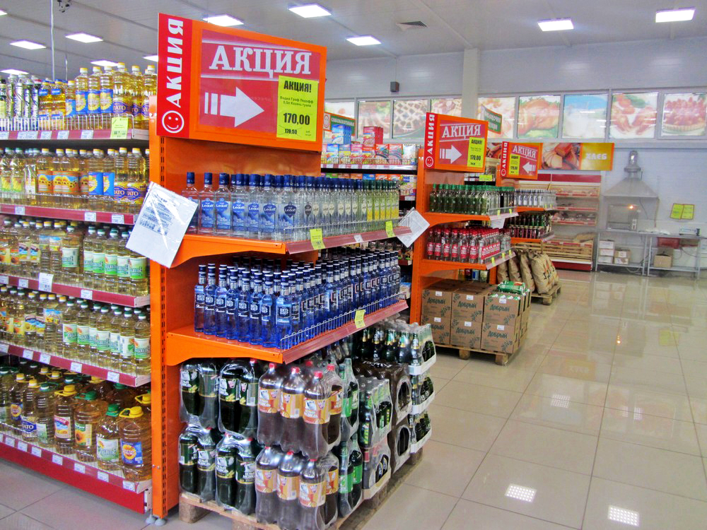 Оборудование: Стеллажи, овощные развалы "Русь"; кассовые боксы и сумочные "Магма"; холодильный шкаф "Премьер"; гриль и тепловая витрина "Sikom".
